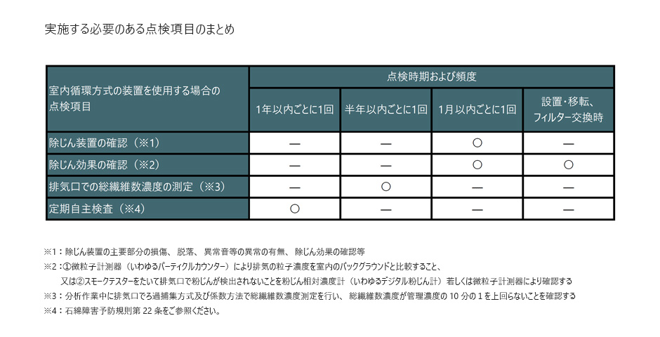 - 除じん装置を1月以内ごとに1回点検すること。点検の主な内容としては、除じん装置の主要部分の損傷、脱落、異常音等の異常の有無、除じん効果の確認等があること。除じん効果の確認方法については、上記の設置時等における粉じんの捕集の確認方法があること。