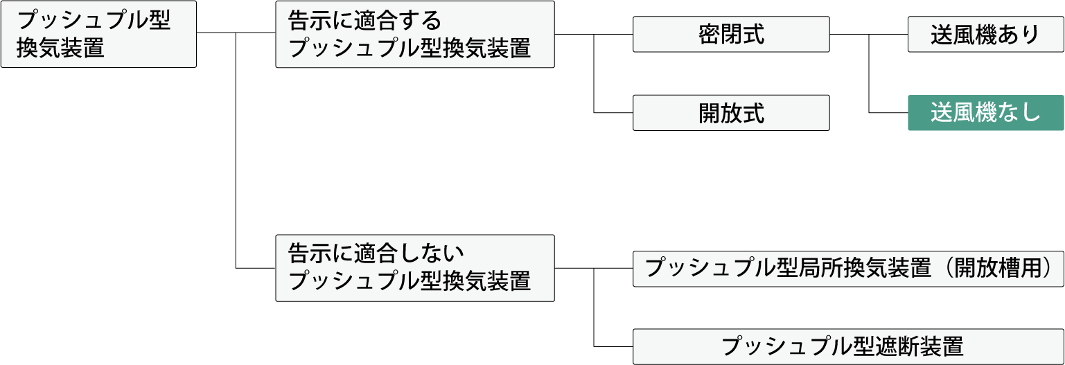 | 法規上の区分 | 局所排気装置 | プッシュプル型換気装置 | 発散防止抑制措置 |
