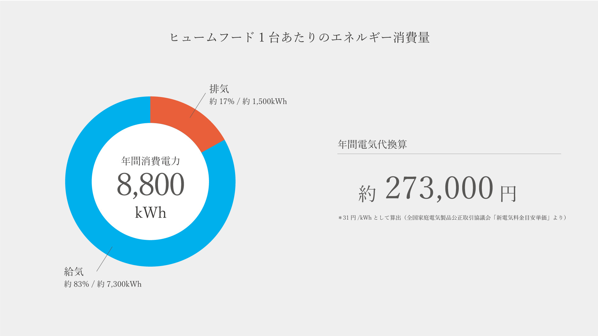 ヒュームフードは1台あたりどれぐらいのエネルギーを消費するのでしょうか? 以下の条件で試算を行いました。