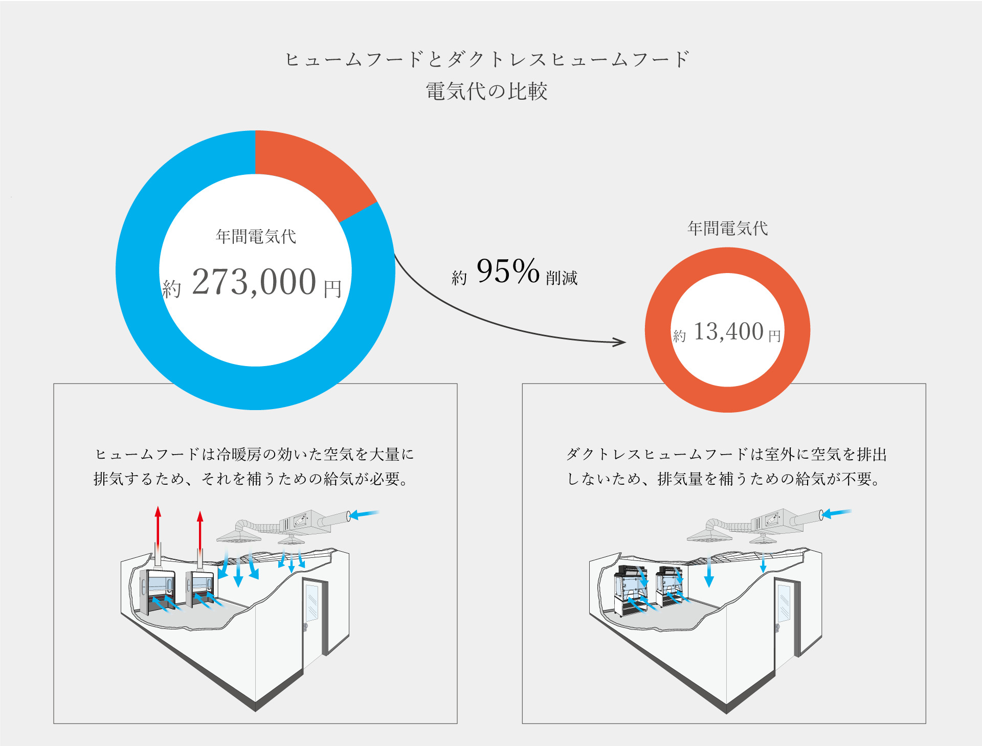 では、どのようにヒュームフードの電気代を削減すればよいのでしょうか?そんな時に役立つのがダクトレスヒュームフードです。ダクトレスヒュームフードは、有害物質を高性能フィルターで除去し、空気を室内に循環させるタイプのヒュームフードです。室外に空気を排出しないため、排気を補うための給気を行う必要がありません。上記試算に用いたヒュームフードと同じ幅の機種でも消費電力は0.22kWhで、1日8時間×240日運転とすると、年間消費電力は約430kWhとなります。これは電気代で約13,400円になります。屋外排気方式のヒュームフードと比較すると、年間電気代を約95%も削減することが可能です。