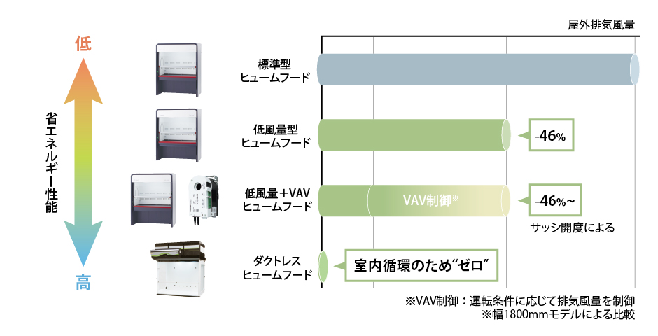 - 必要風量の決定 - 低風量タイプ(高封じ込め型)、風量可変制御(VAV)タイプ、ダクトレスフードの導入検討