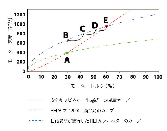 [図3] 右図はECモーターが一定風量を維持する仕組みを表している。一定風量曲線は、安全キャビネットが一定の風量(800CFM)を維持するために必要なモーターのトルクと速度を示している。この曲線は、解析・測定のプロセスで生み出される一連の定数としてモーターにプログラムされている。緑色の曲線は、安全キャビネットに使用される新品のフィルターの圧力を表している。HEPAフィルターが物質を捕集するにつれて、圧力は青い曲線に近づいていく。安全キャビネットは、フィルターが目詰まりするまで、点「A」で安定して動作する。目詰まりが進行するにつれて、圧力の増加および風量が減少した結果、ブロワーの速度は点「B」まで上昇する。このスピードの上昇は、あらゆるタイプのモーターで発生し、氷上やスリップで牽引力を失う自動車のタイヤに似ている。