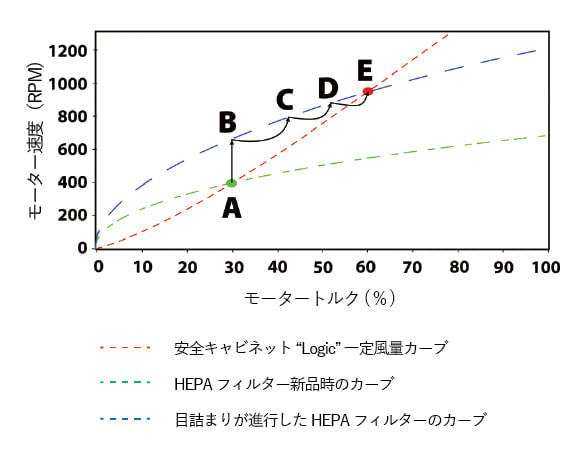 安全キャビネットは、フィルターが目詰まりするまで、点「A」で安定して動作する。目詰まりが進行するにつれて、圧力の増加及び風量が減少した結果、ブロワーの速度は点「B」まで上昇する。このスピードの上昇は、あらゆるタイプのモーターで発生し、氷上やスリップで牽引力を失う自動車のタイヤに似ている。