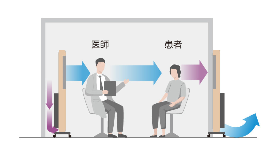 | ブース内部を陰圧に保つことで、咳等による汚染エアロゾルがブース外部に拡散することを防止します。 |