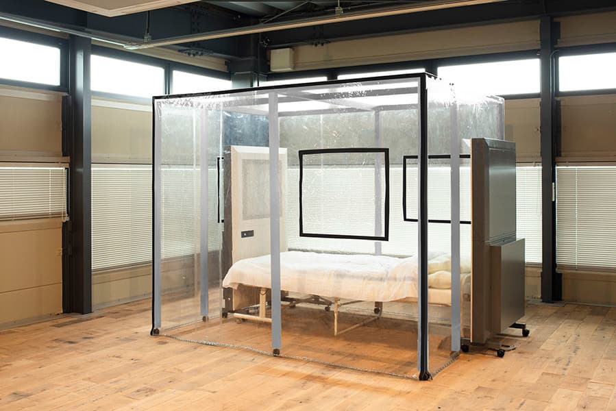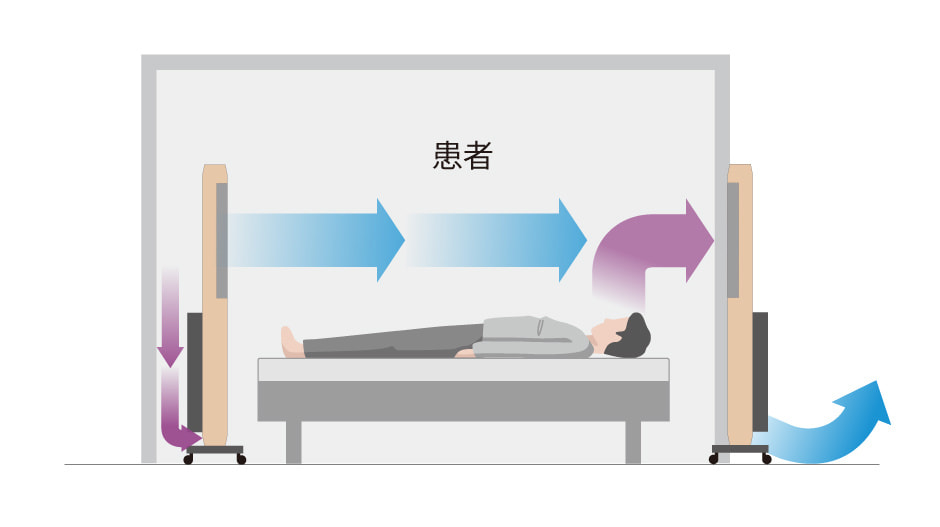 患者のベッドを陰圧ブースで囲うことで隔離し、室内にいる他者への飛沫暴露を防止します。