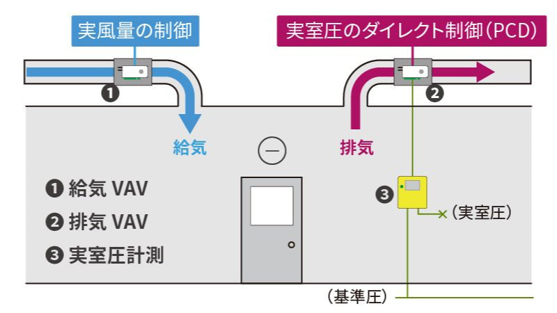 室内の圧力を常時モニタリングし、その情報を給排気システムにフィードバック。ドアの開閉などにより室圧が変動した場合にも、システムが即座に給排気のバランスを制御することで、安定した室圧を実現します。