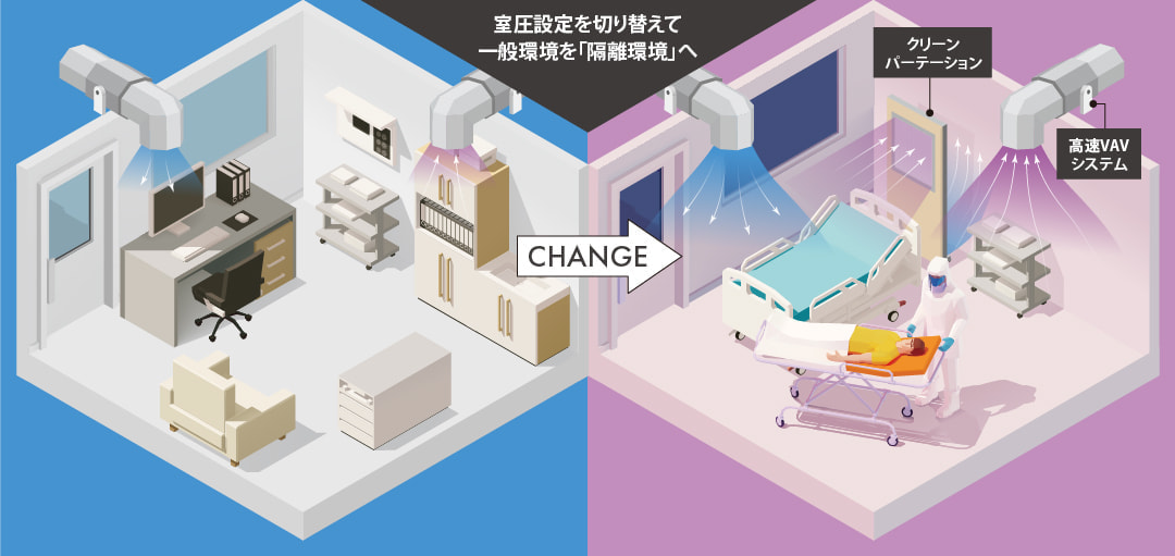 高性能室圧制御と大容量空気清浄システムでウイルスや細菌の拡散を防止