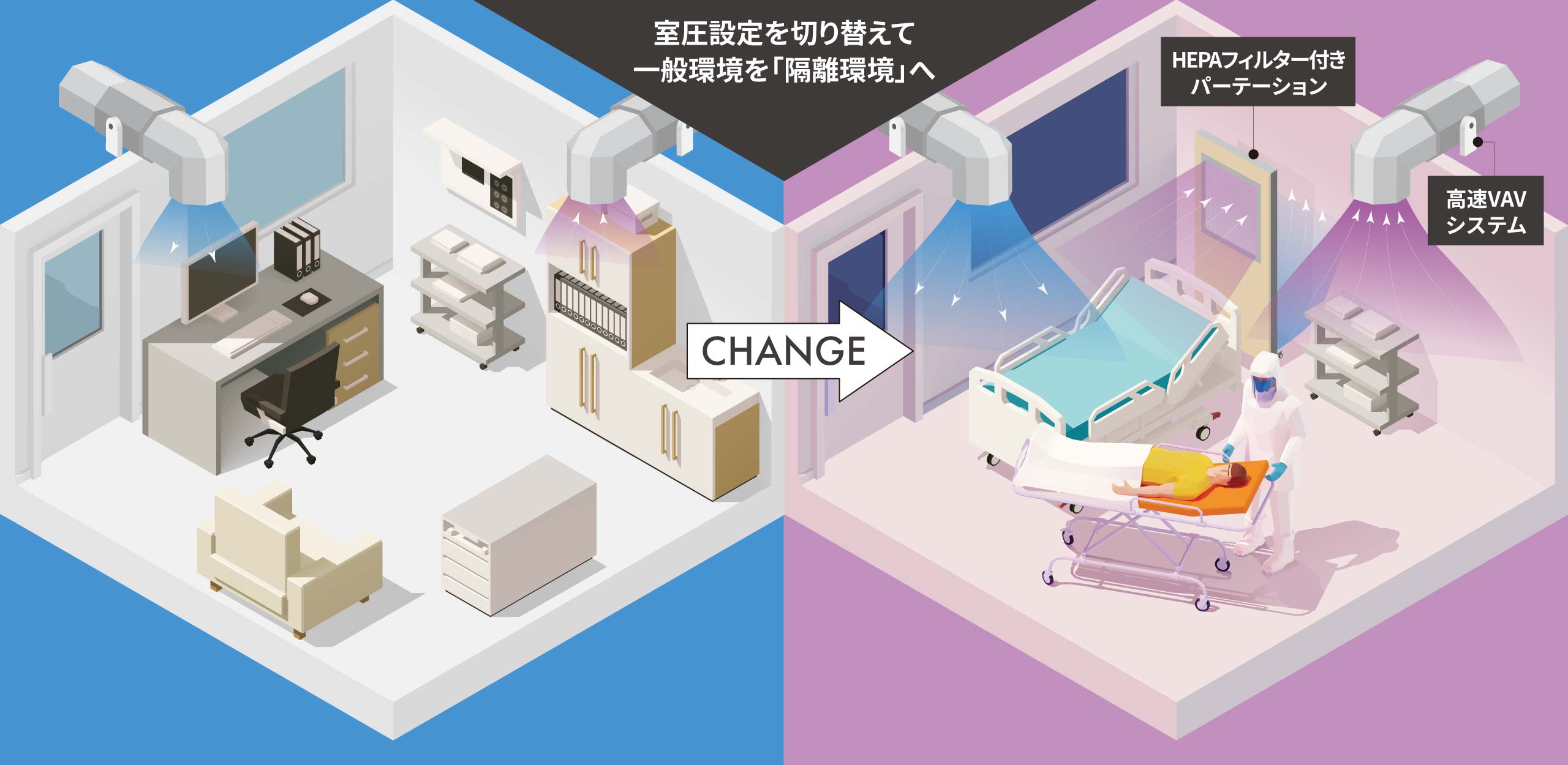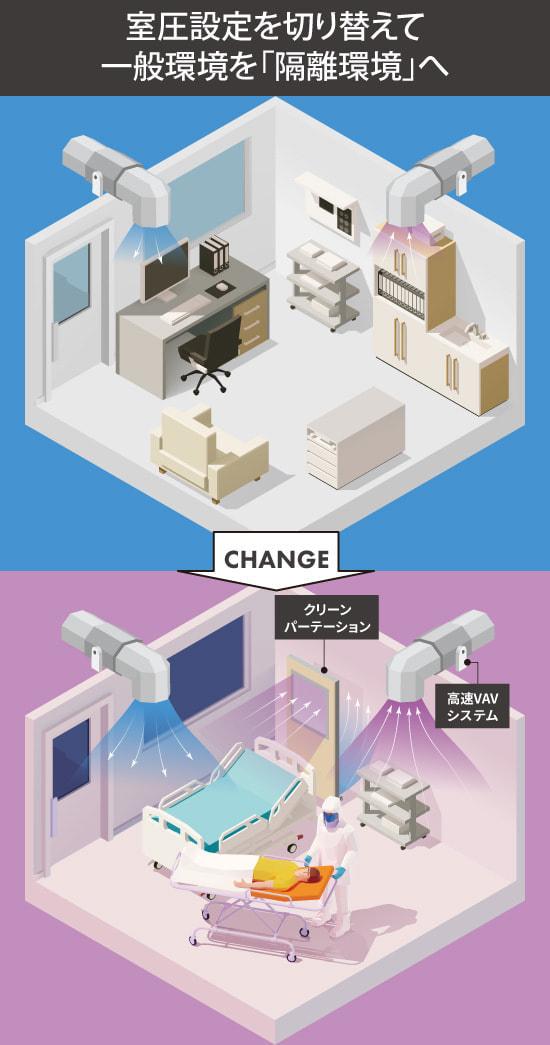 高性能室圧制御と大容量空気清浄システムでウイルスや細菌の拡散を防止