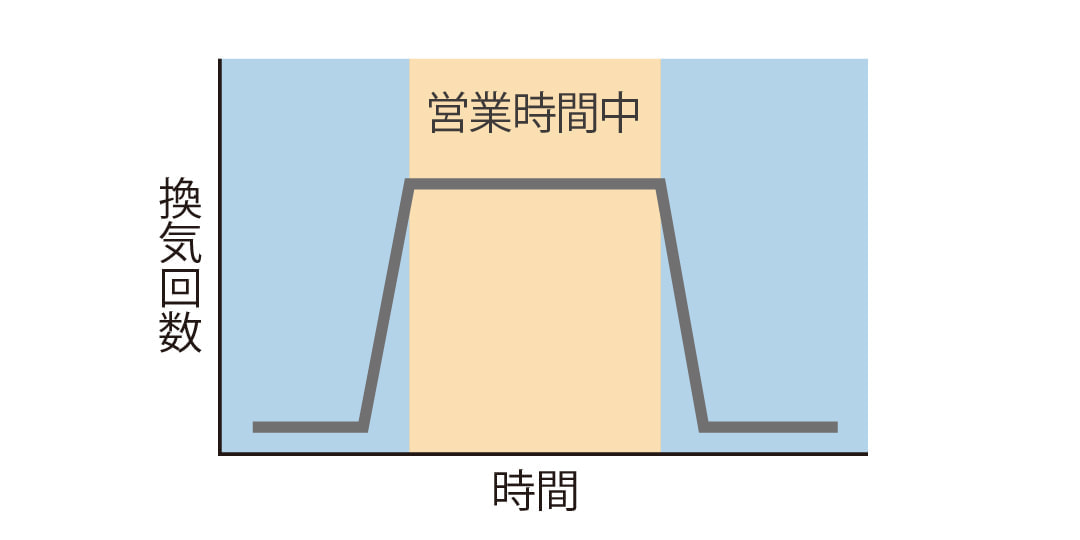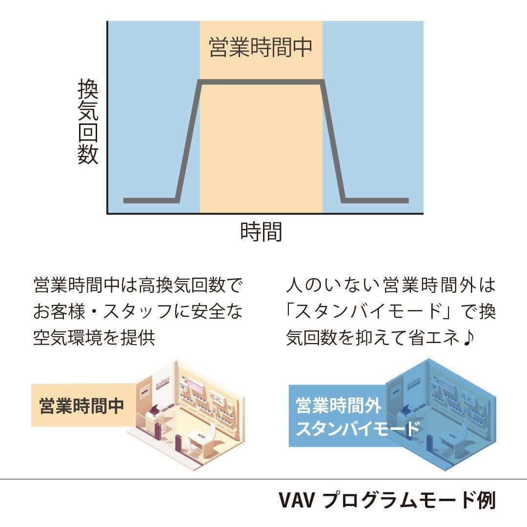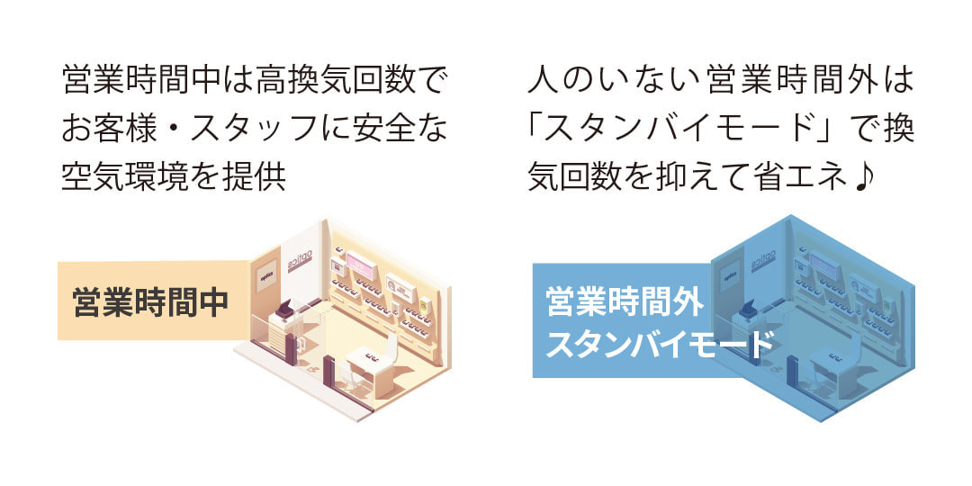 店舗などで使用する場合には、営業時間外の換気回数を最小限に抑える「スタンバイモード」などのプログラムを設定することで、空調負荷を抑制。施設の省エネにも貢献します。