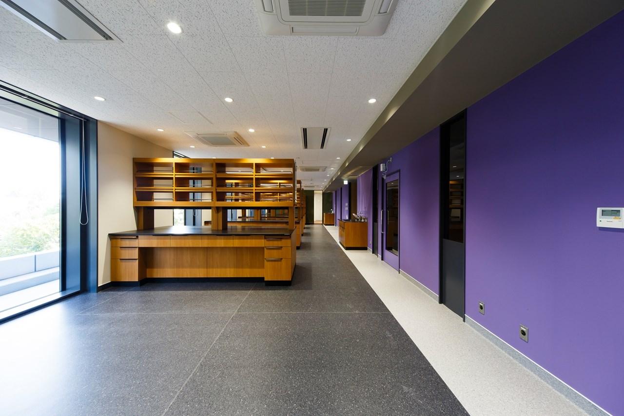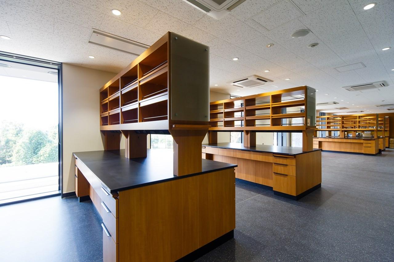 プラナスの設計により、ラボ内のあらゆる意匠に、山吹色などの日本伝統の色合いが取り入れられていました。せっかくの室内イメージを崩すことが無いように、実験台等の研究設備は伝統色に合う木目色を採用しました。
