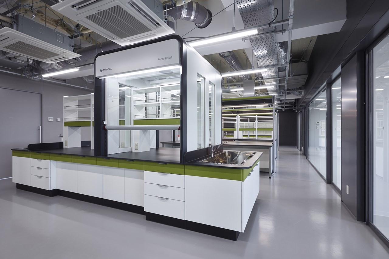 実験台・ヒュームフード等の異なる実験設備であっても、同じアクセントラインを取り入れることで、異なる形状の製品に統一感を持たせるデザインを目指しました。