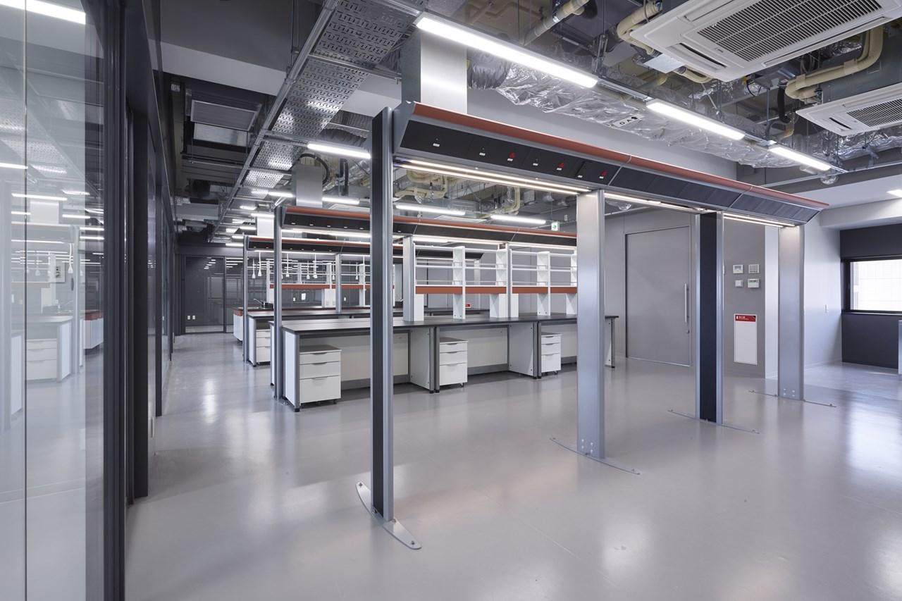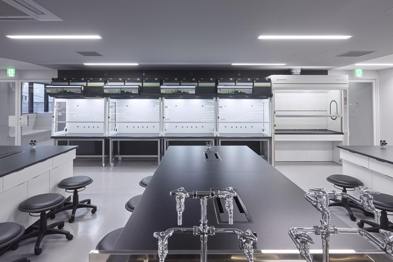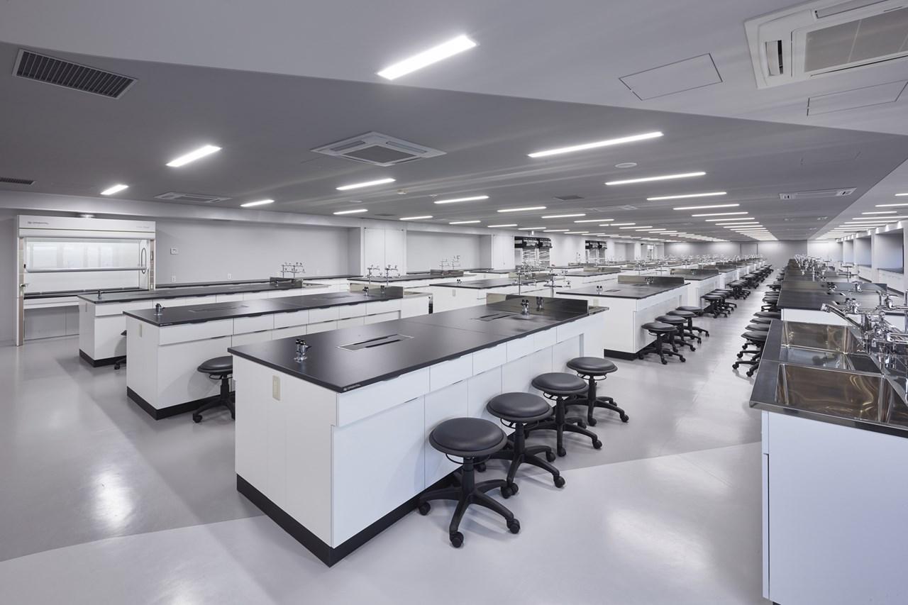 キャンパスの目印、そしてゲートウェイとして建設された新たな薬学研究棟。本棟内には、実験室・研究室といったラボラトリーエリアに加えて、講義室や実習室、教員オフィスまでをも包括した総合的なラボラトリーとなっています。