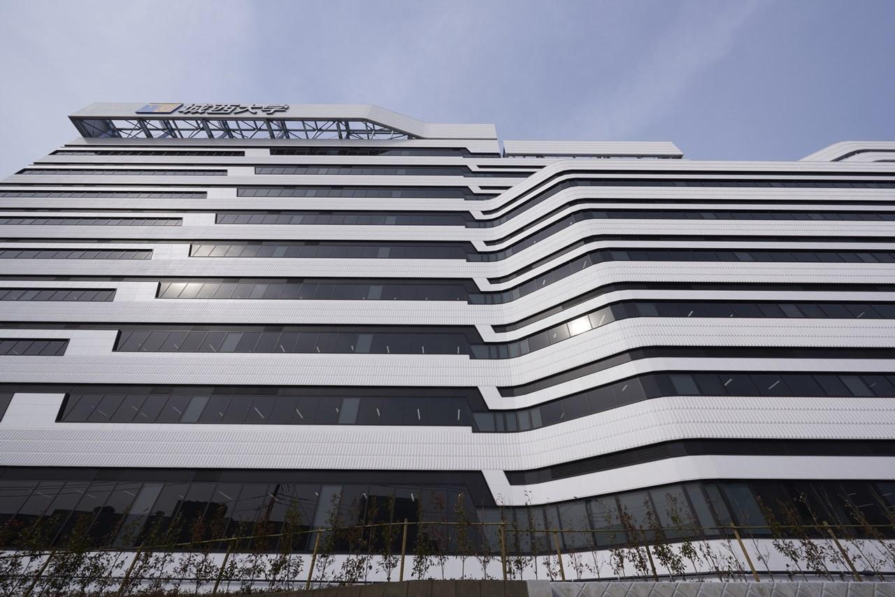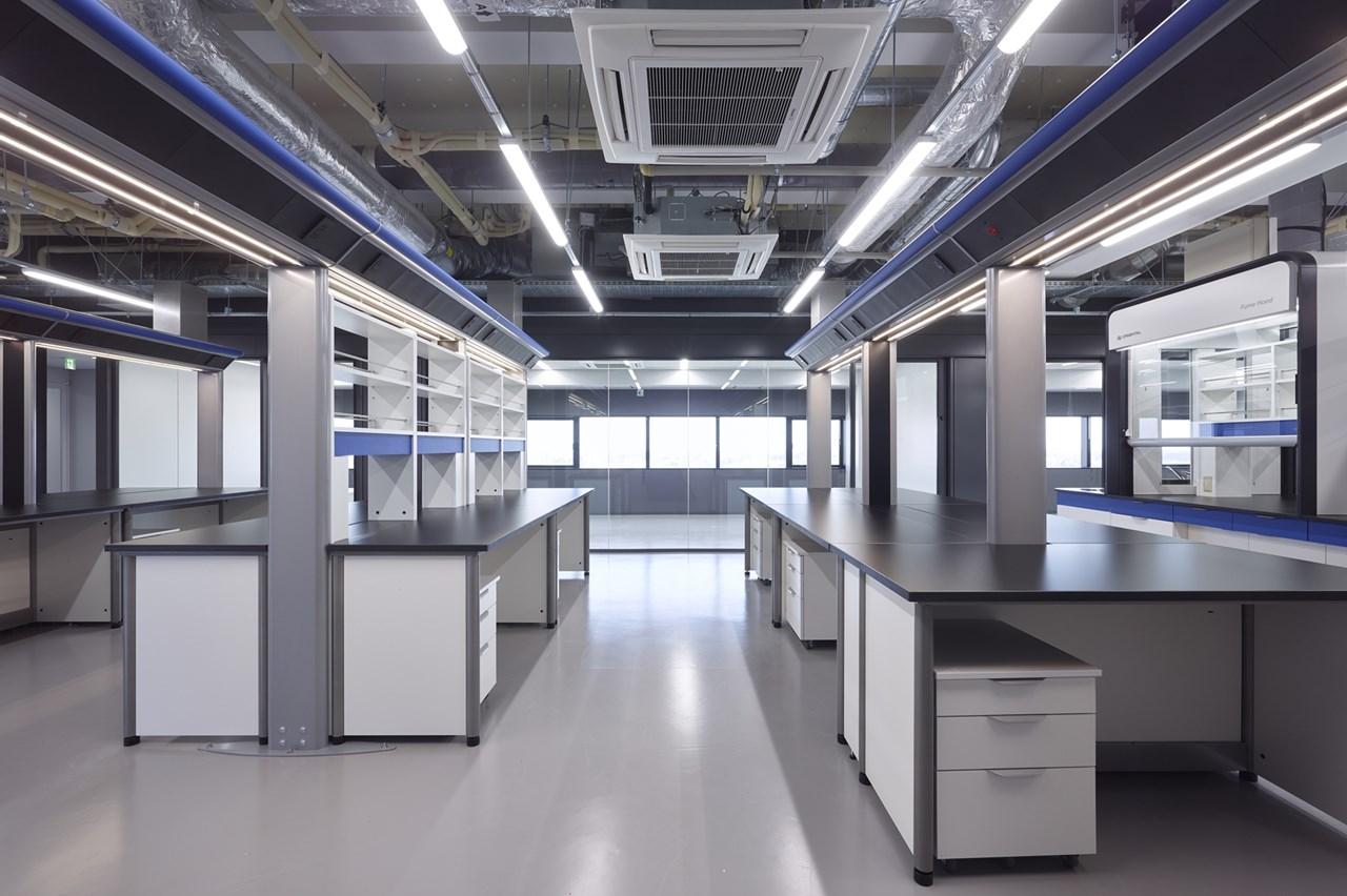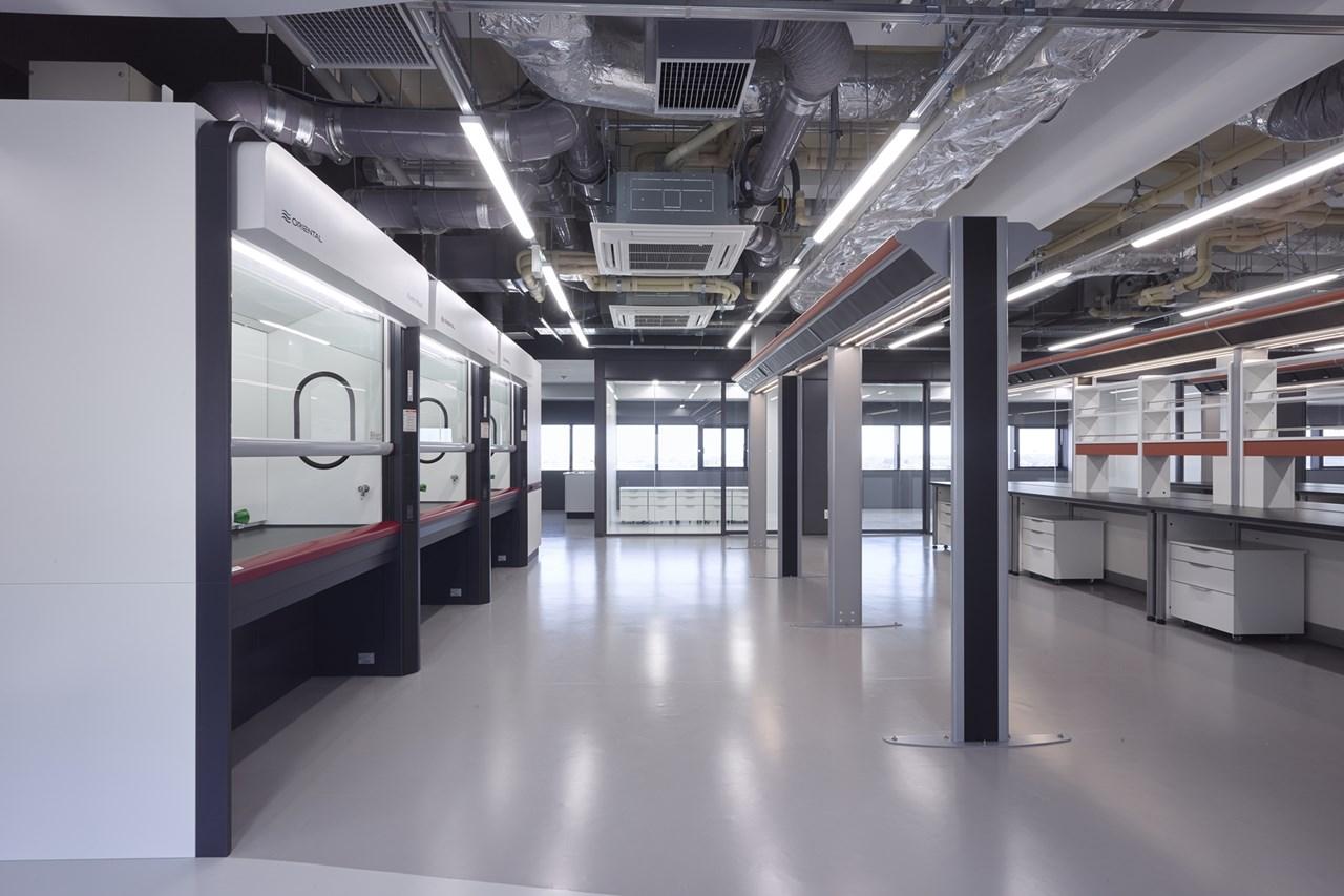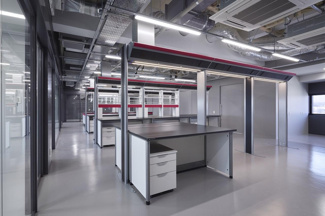キャンパスの目印、そしてゲートウェイとして建設された新たな薬学研究棟。本棟内には、実験室・研究室といったラボラトリーエリアに加えて、講義室や実習室、教員オフィスまでをも包括した総合的なラボラトリーとなっています。