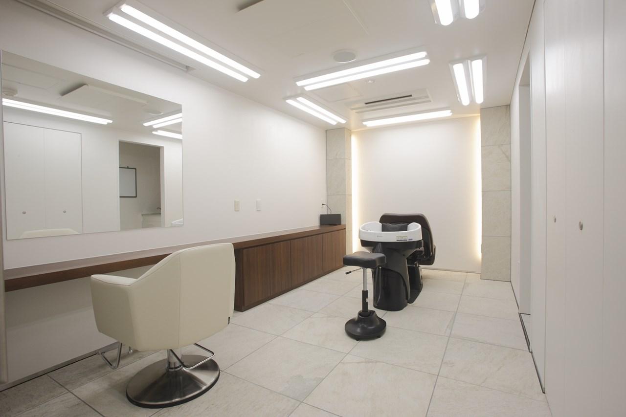 天板の色は光を邪魔しないパールグレーに。試薬棚の上部には、「部屋と天井を照らす上向きライト」を取り入れました。実験台の側面には、ヘアカラーをいつでも確認できるように鏡を設置し、光の当たり方を詳細に確認できるかLED照明ライトが完備されています。