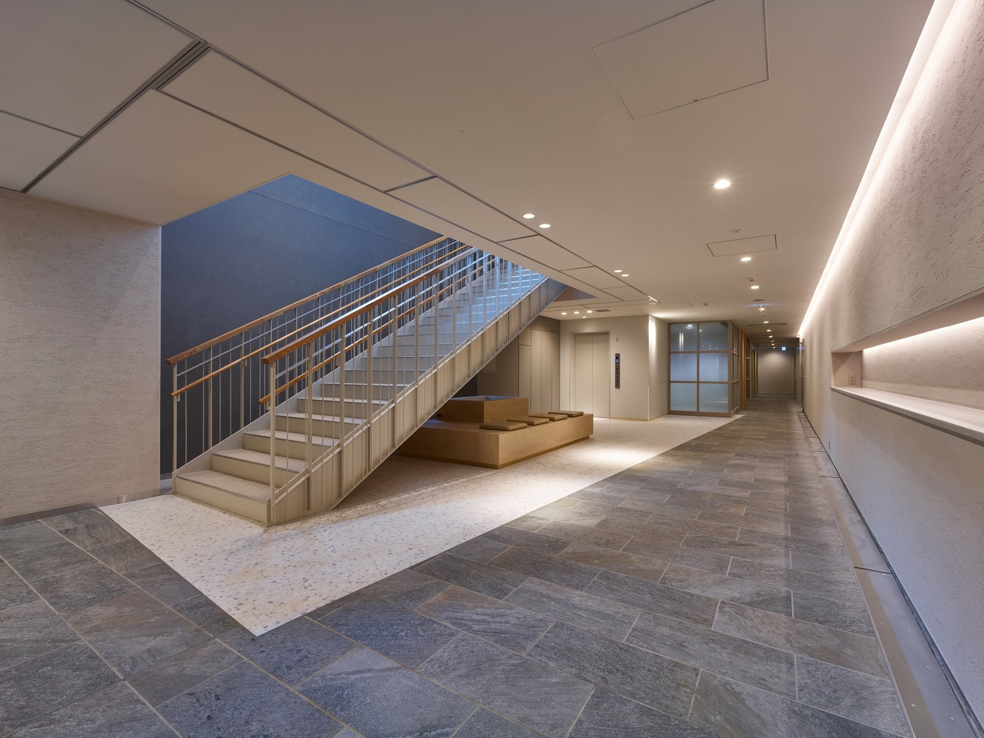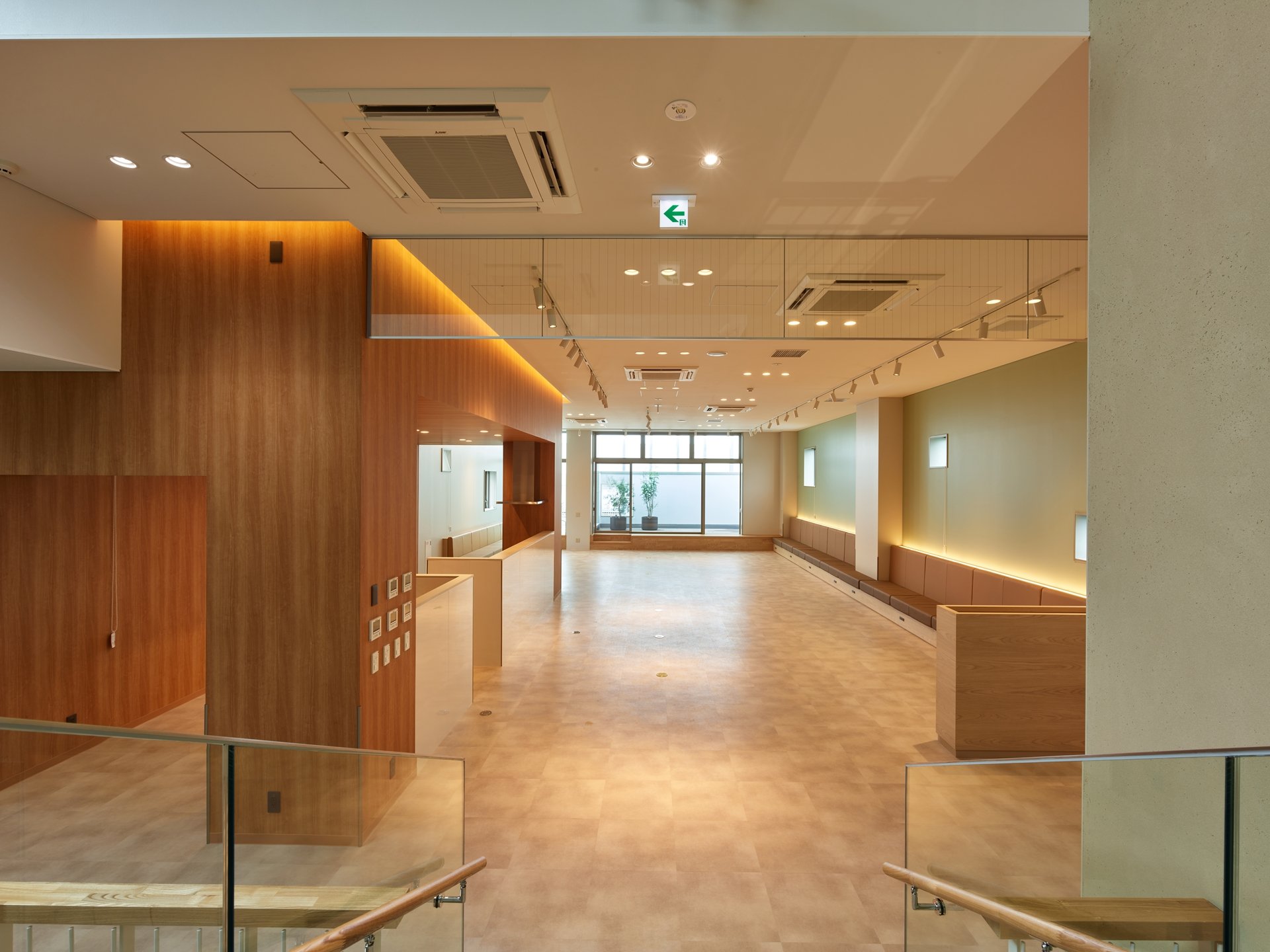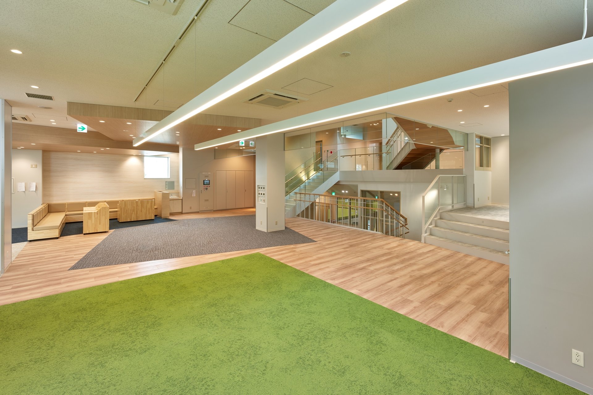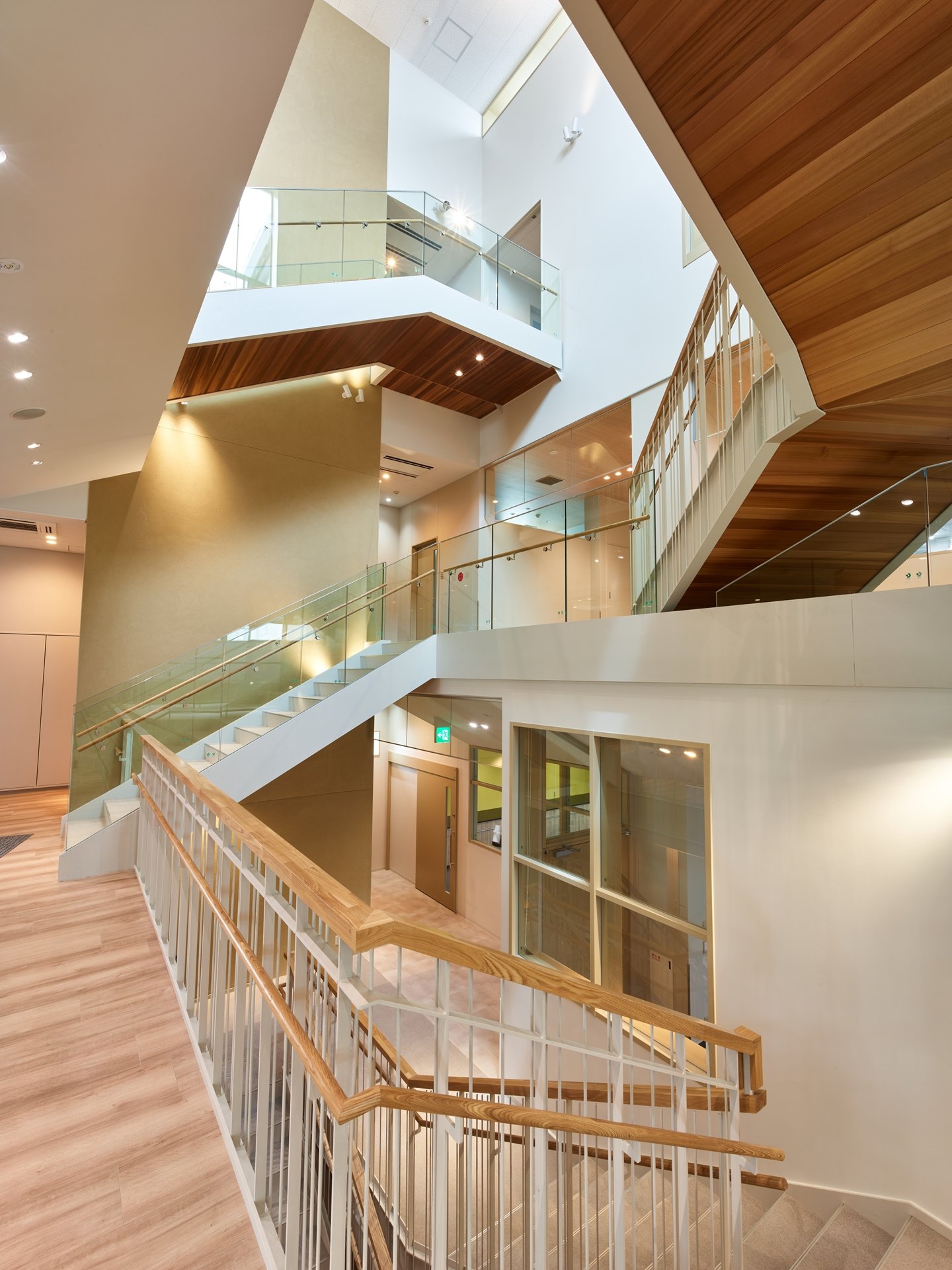 実験室とオフィスを結ぶ空間にはステップフロアの間取りを採用し、踊り場などで軽い打ち合わせができるような造りにすることでコミュニケーションの活性化を図りました。