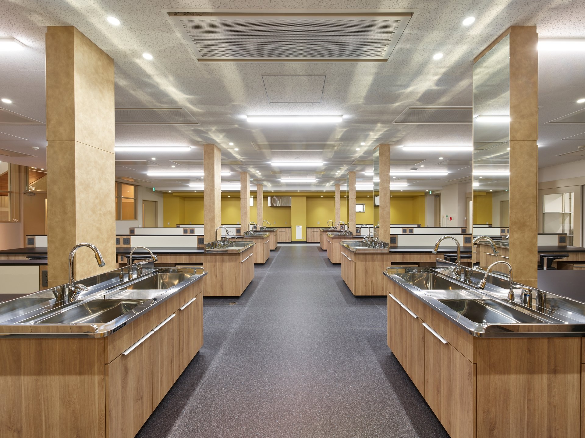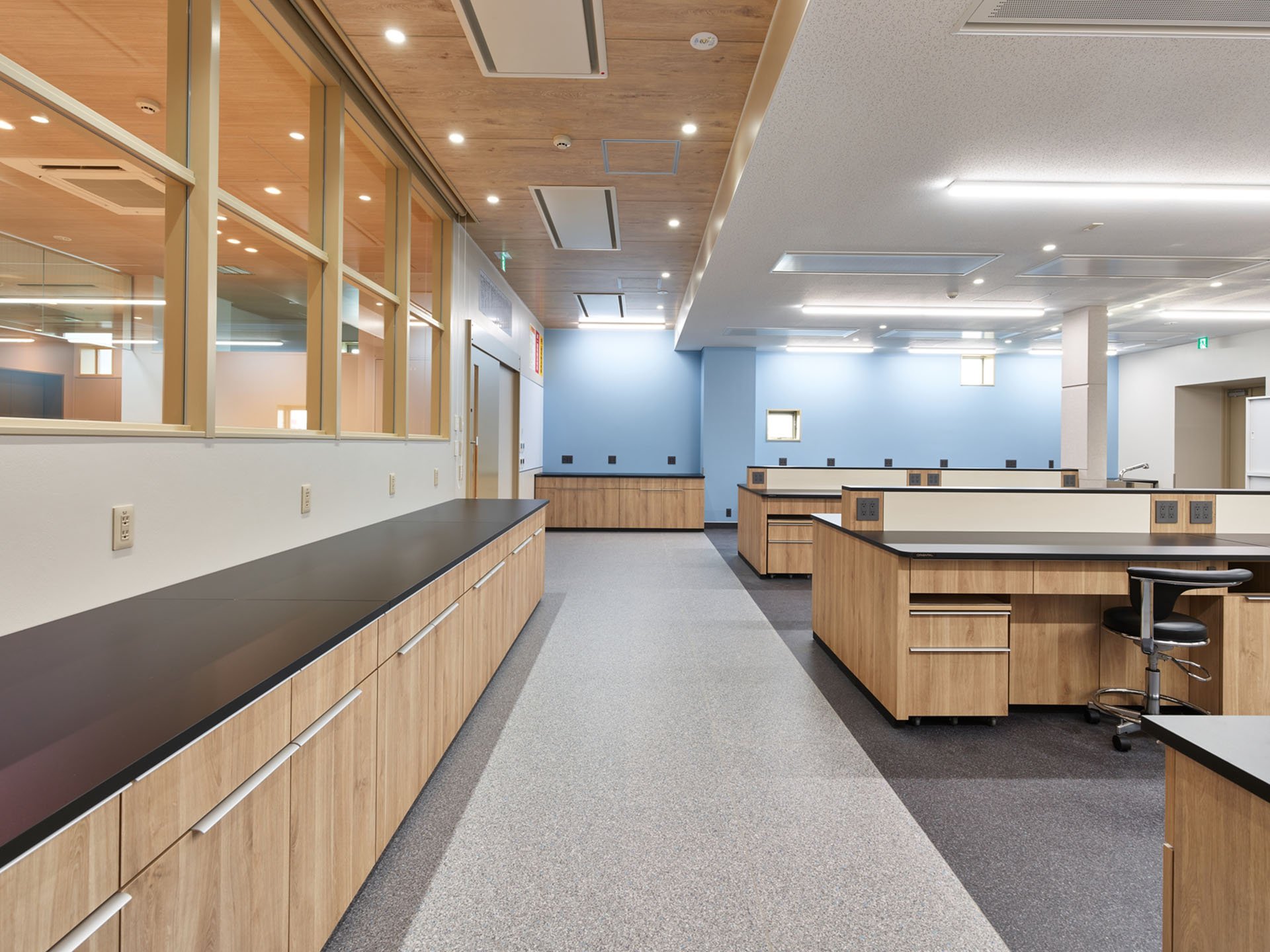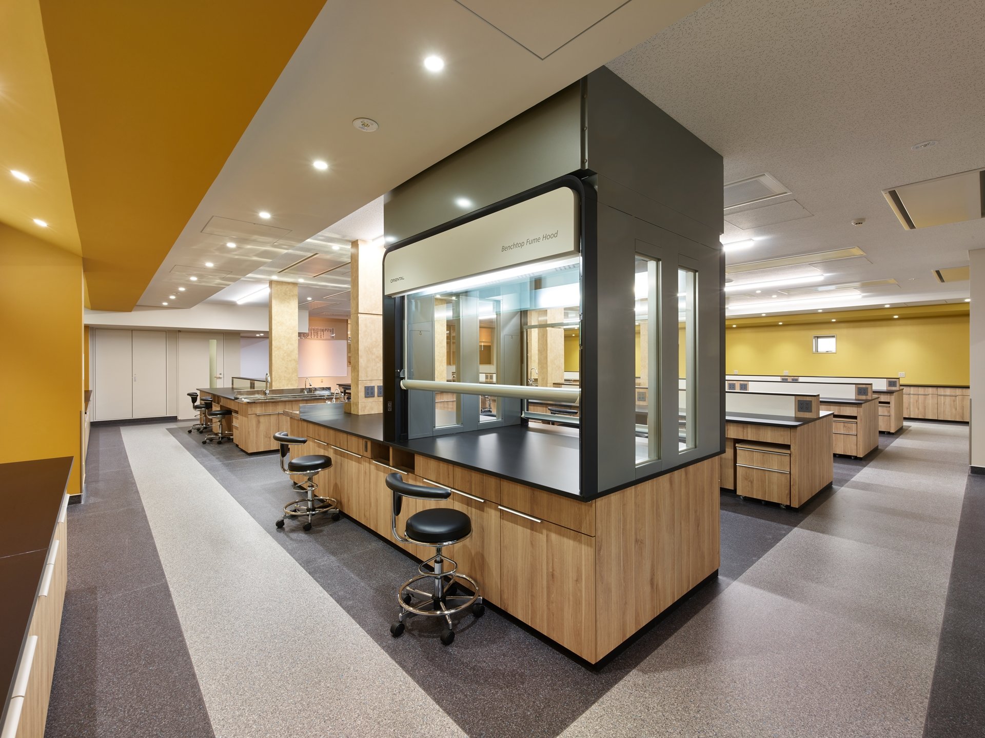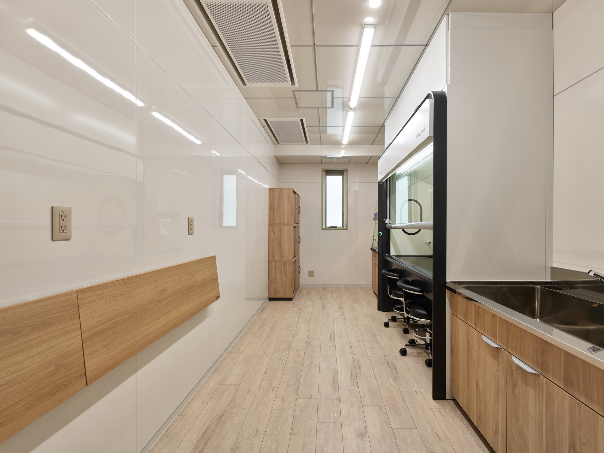 外部のお客様が来訪することを想定しながら、研究室のデザインを検討しました。各部署のコミュニケーションの活性化が図れる空間を実現するために、実験台のベースを木目調にして温かみがある造りとしました。