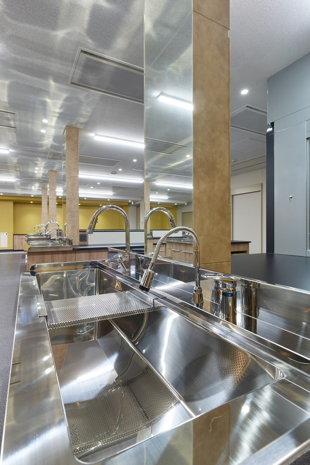 また、配管収納ボックスの前面に鏡を付けて室内に開放感をもたらすなど、建築全体・研究室の雰囲気に合うように研究設備のデザインを行いました。