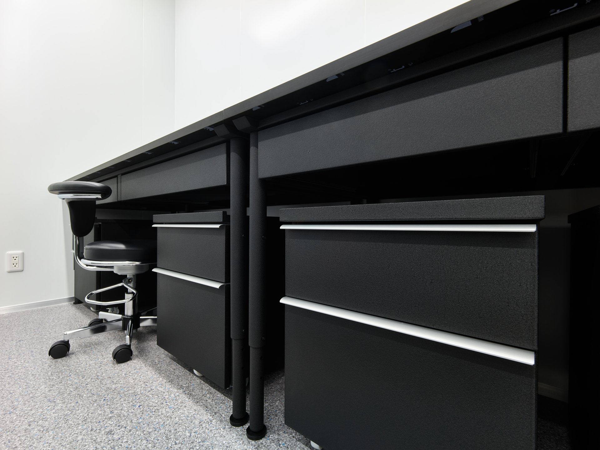さらに上質な空間を構築するために、恒温恒湿室にはシボ塗装を施したスチール製作業台を設置。 シボ塗装はワンランク上の上質感を与えるだけでなく、汚れの目立ちにくいという特徴もあります。